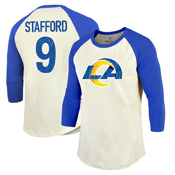 Men S Fanatics Branded Matthew Stafford Cream Royal Los Angeles Rams Player Name Number Raglan 3 4 Sleeve T Shirt